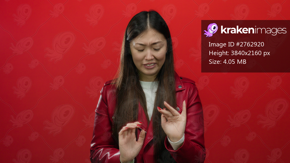 Woman displaying disgust on a vibrant red background wearing a red jacket, emphasizing emotion, facial expression, chinese ethnicity, and asian culture. - Kraken Images