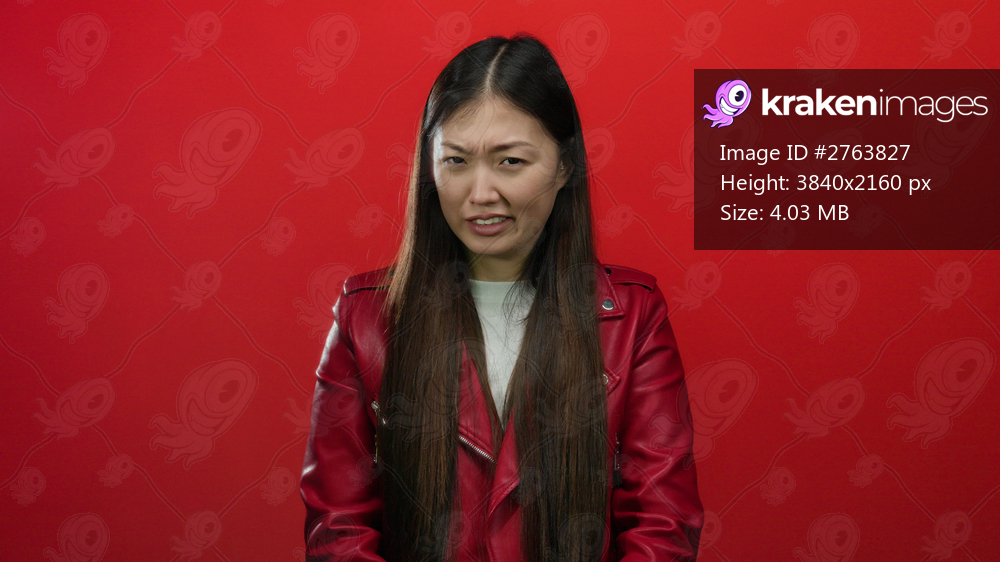 Woman displaying disgust on a vibrant red background wearing a red jacket, emphasizing emotion, facial expression, chinese ethnicity, and asian culture. - Kraken Images