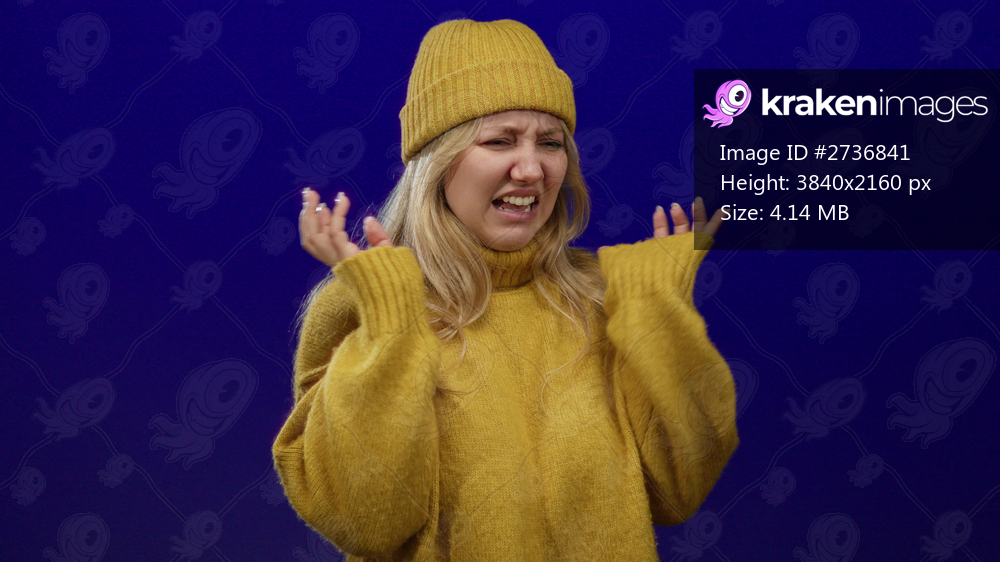 Woman displaying disgusted expression in a yellow sweater and hat against a vibrant blue background.
