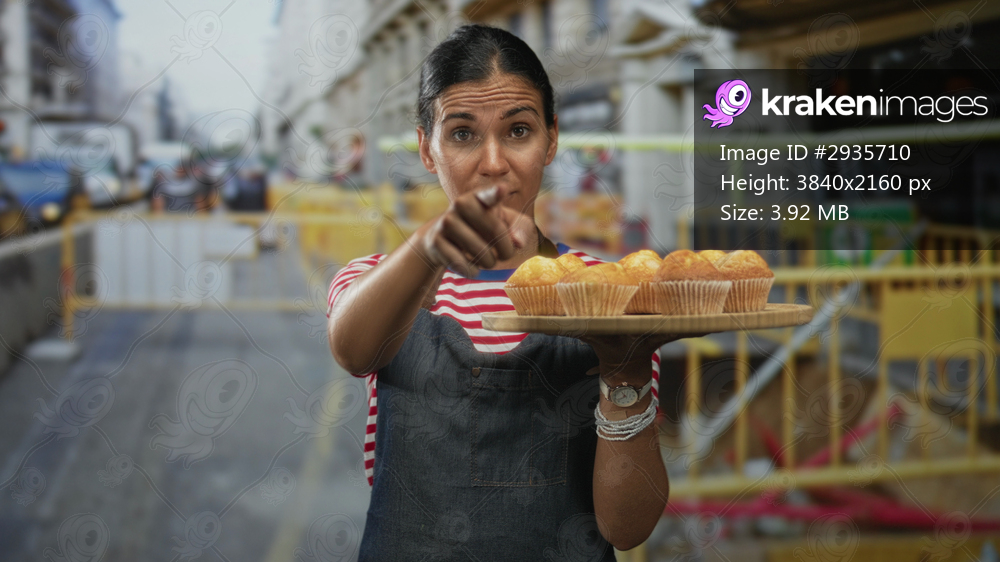 Woman displaying fresh muffins on a wooden tray, wearing denim apron and striped shirt, and points finger forward on street; confidence offering.