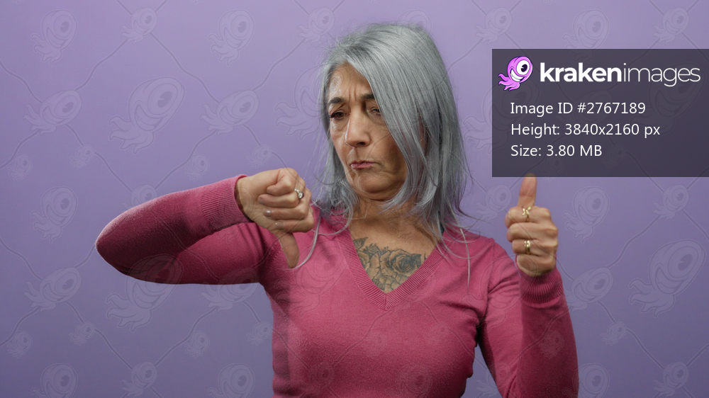 Woman displaying mixed emotions with thumbs up and down against a purple wall, showcasing contrasting feelings and decision making in a vibrant setting. - Kraken Images