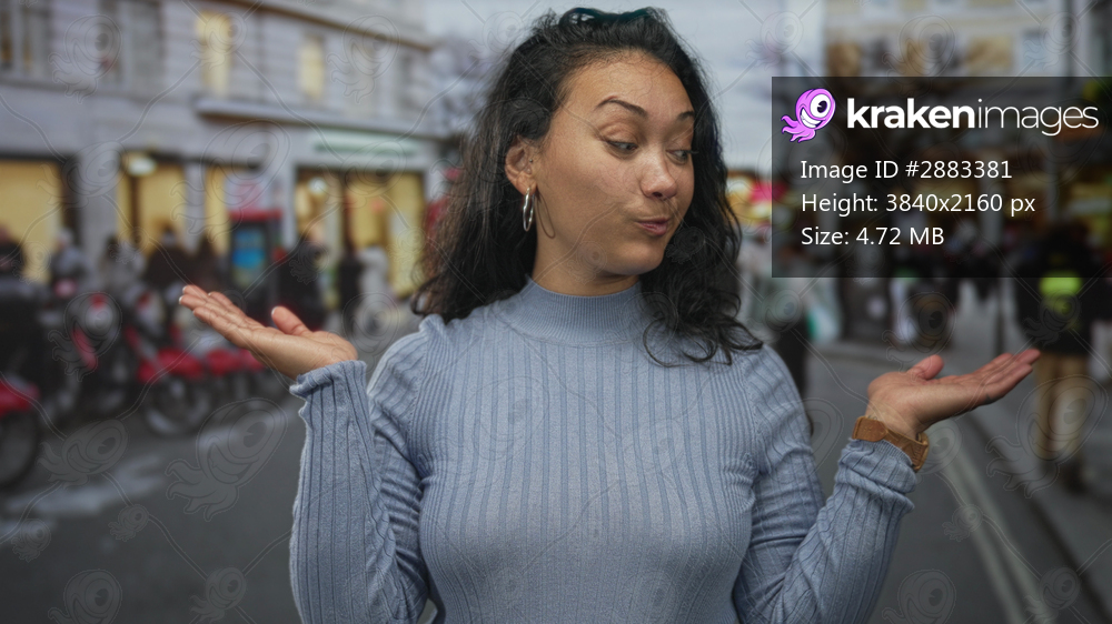 Woman displaying palms up shrug gesture on a busy city street with bicycles and storefronts in view; bemusement.
