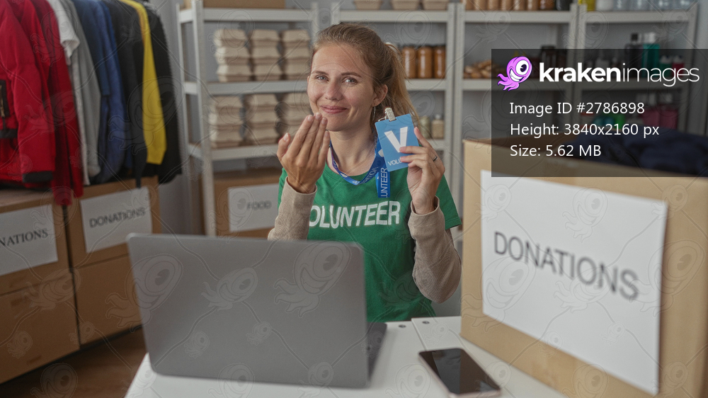 Woman displays badge and pointing gesture in center as volunteer beside laptop and smartphone, smiling with blonde young features.
