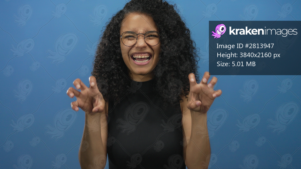 Woman displays claw gesture with both hands and smiling face wearing glasses in blue studio; joyful amusement.