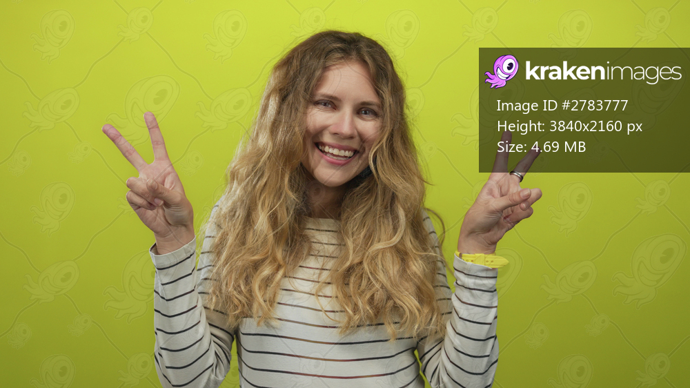 Woman displays hand with a peace sign in a studio backdrop beside blonde young smiling subject wearing striped shirt and watch for portrait.