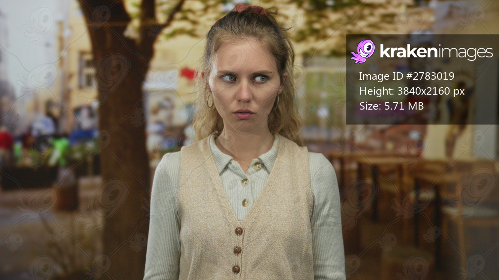 Woman displays hand refusal on street while a blonde young subject closes eyes in clear gesture showcasing a solemn facial expression.