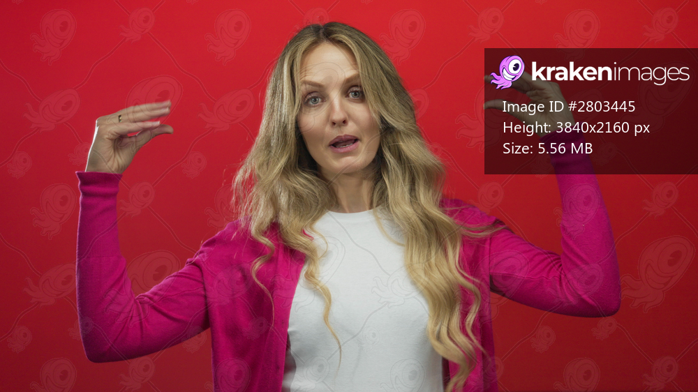 Woman displays hands in a gossip gesture inside a studio with young blonde energy against a red background on an isolated wall.