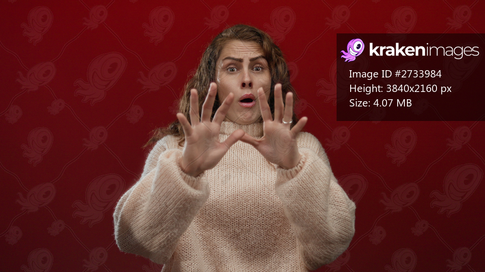 Woman displays surprised reaction against a vivid red background wearing a cozy sweater, capturing emotions with expressive eyes and hands, perfectly isolated for creative projects. - Kraken Images