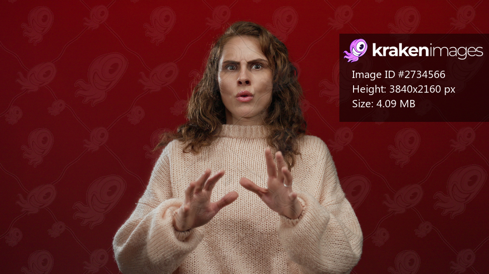 Woman displays surprised reaction against a vivid red background wearing a cozy sweater, capturing emotions with expressive eyes and hands, perfectly isolated for creative projects. - Kraken Images