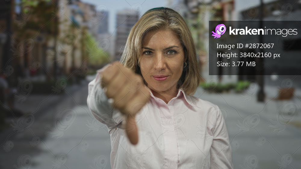 Woman displays thumbs down gesture on narrow urban street lined with benches and trees under daylight; disapproval.