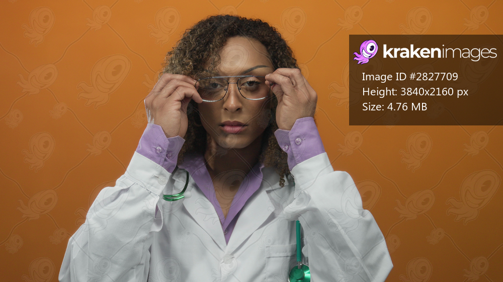 Woman doctor adjusts glasses with stethoscope hanging around neck in orange studio; confidence pride resilience.