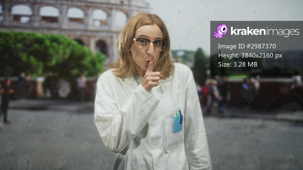 Woman doctor with blonde hair and eyeglasses in white coat, finger to lips for silence in front of building; calm reassurance.