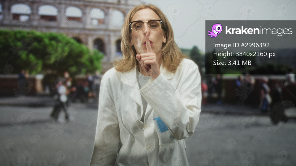 Woman doctor with blonde hair and eyeglasses in white coat, finger to lips for silence in front of building; calm reassurance.