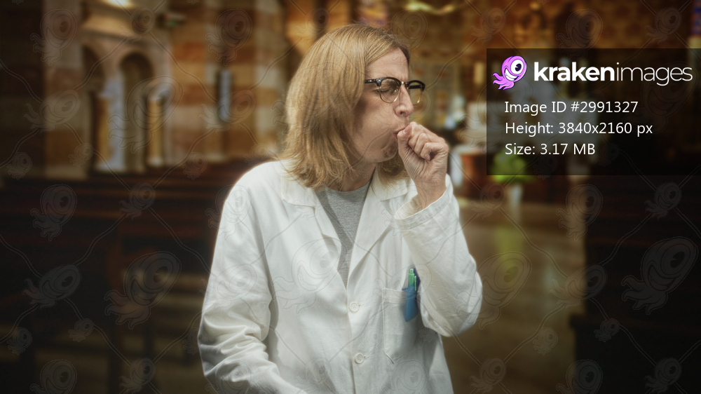 Woman doctor with blonde hair in white lab coat coughs into her hand inside a church near pews and altar, wearing glasses and pens in pocket; health concern. - Kraken Images