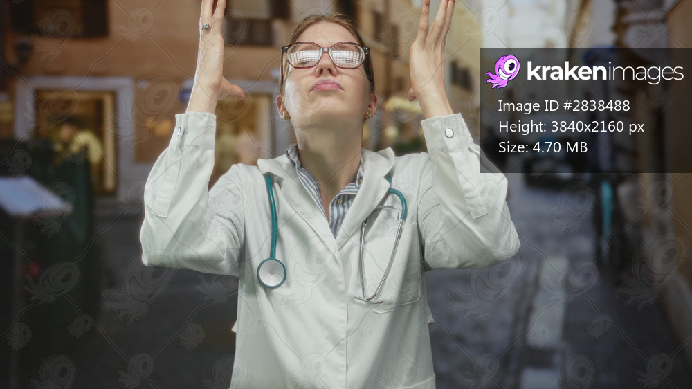 Woman doctor with blonde hair in white labcoat and stethoscope adjusts glasses with closed eyes on city street; serenity.