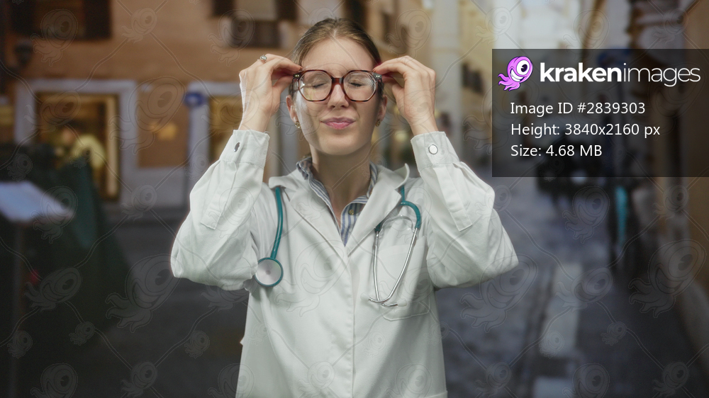 Woman doctor with blonde hair in white labcoat and stethoscope adjusts glasses with closed eyes on city street; serenity.