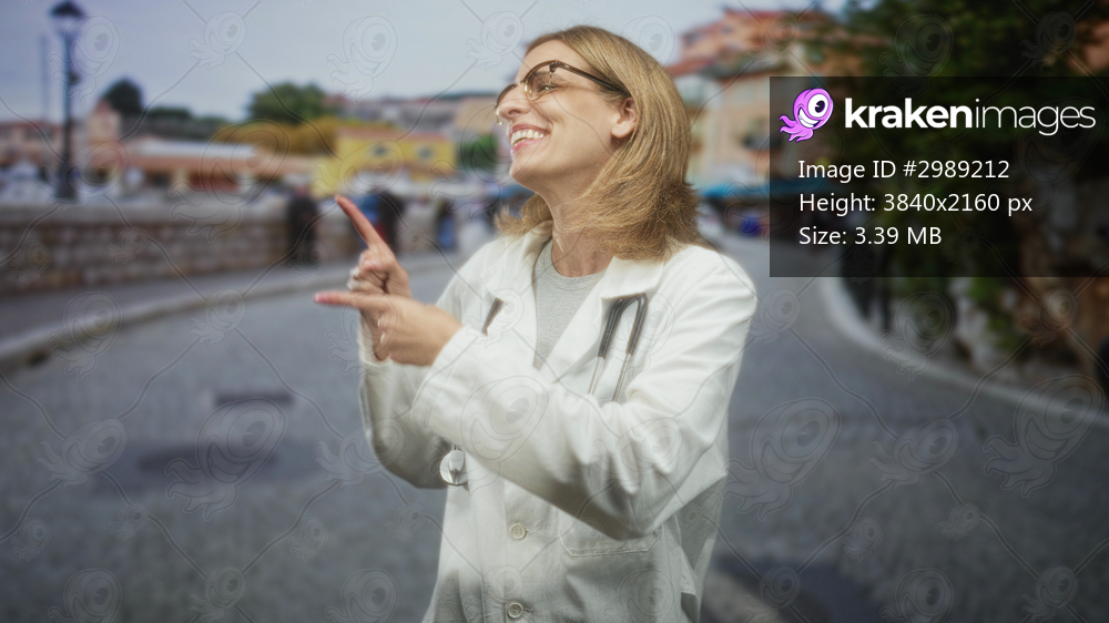 Woman doctor, blonde and wearing glasses, in white coat with stethoscope, points finger to right while smiling on a cobblestone street lined with buildings; joyful curiosity. - Kraken Images