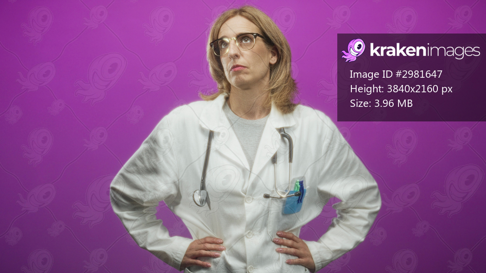 Woman doctor blonde wearing glasses with stethoscope hands on hips looking exasperated in studio; frustration perseverance.