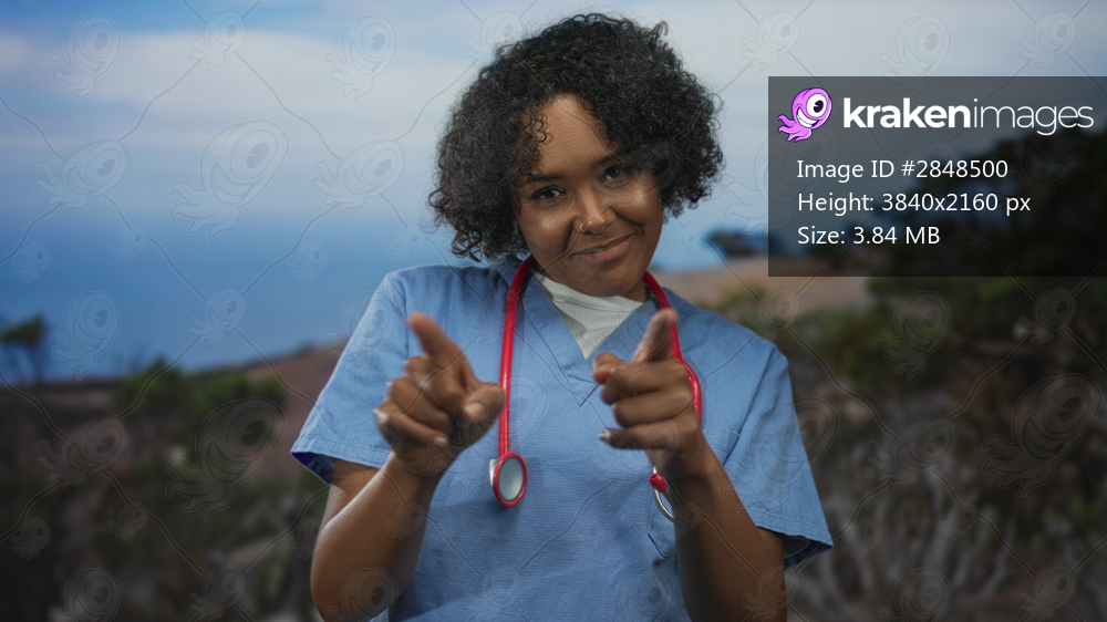Woman doctor blows a kiss and makes a finger heart gesture in forest outdoors; affection compassion.