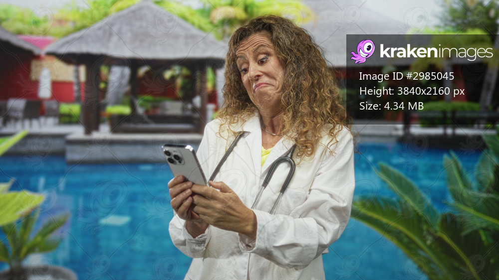 Woman doctor checks smartphone with stethoscope visible, shrugging skeptical face while standing poolside by tropical resort cabana and palm plants; skepticism work life. - Kraken Images