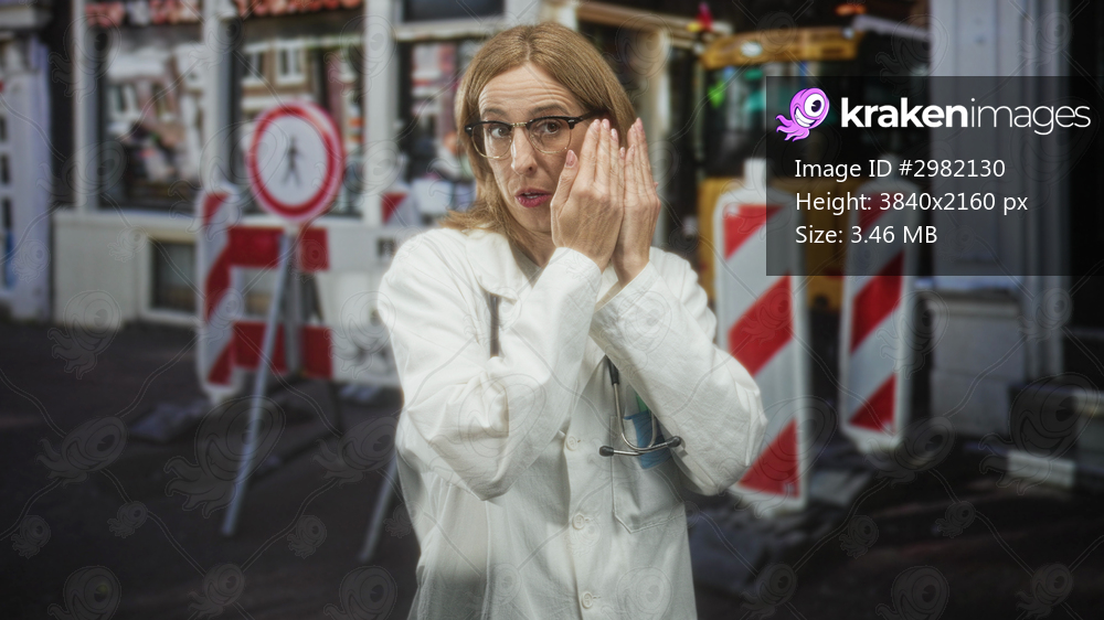 Woman doctor covers face with hands on a street near construction barriers and pedestrian sign; anxiety fatigue.
