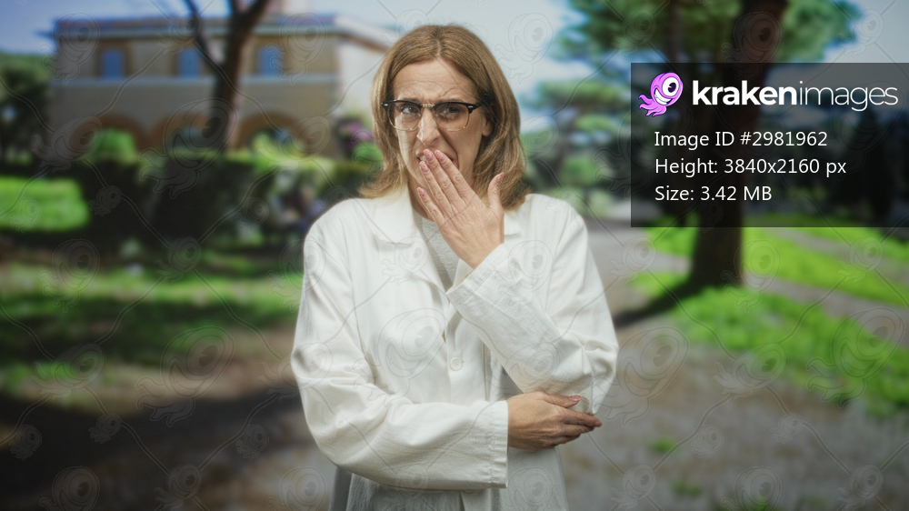Woman doctor covers mouth with hand on building pathway, white lab coat and glasses visible; disgust concern.