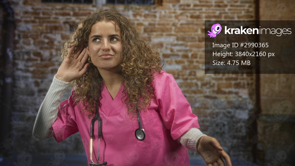 Woman doctor with curly hair cups her ear with hand while wearing a stethoscope against a brick building wall, listening intently; attentive listening. - Kraken Images