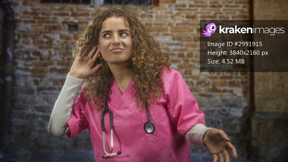 Woman doctor with curly hair cups her ear with hand while wearing a stethoscope against a brick building wall, listening intently; attentive listening. - Kraken Images