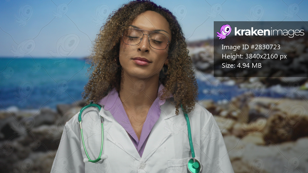 Woman doctor with curly hair holding a green stethoscope against her white coat at a rocky seaside; calm dedication.
