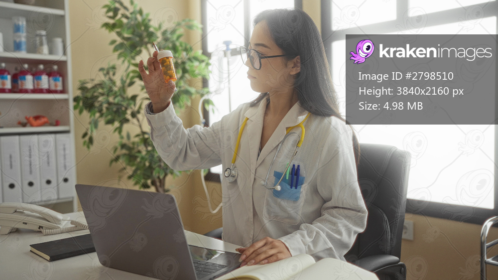 Woman doctor examines medicine bottle in a clinic, highlighting her focus in a hospital setting, with a laptop and stethoscope on the desk, showcasing a professional environment. - Kraken Images