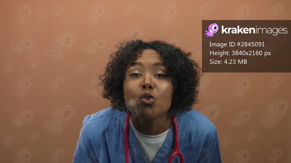 Woman doctor forming a finger heart gesture and blowing a kiss toward the camera in a studio scene; compassion bond.