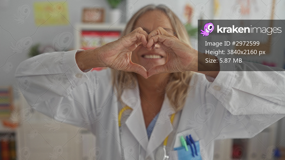 Woman doctor forming heart with hands in clinic with stethoscope and pens visible; care compassion warmth.