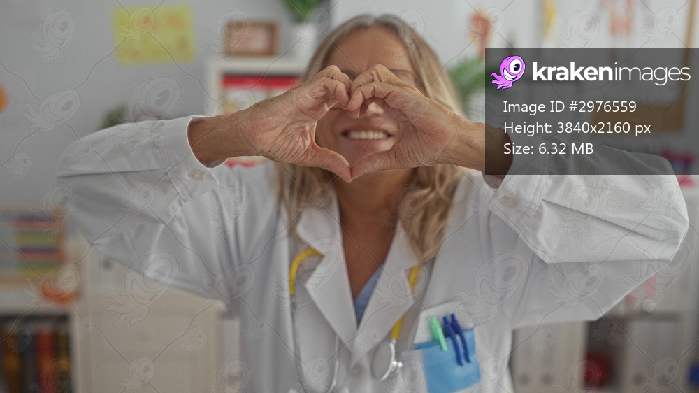 Woman doctor forming heart with hands in clinic with stethoscope and pens visible; care compassion warmth.