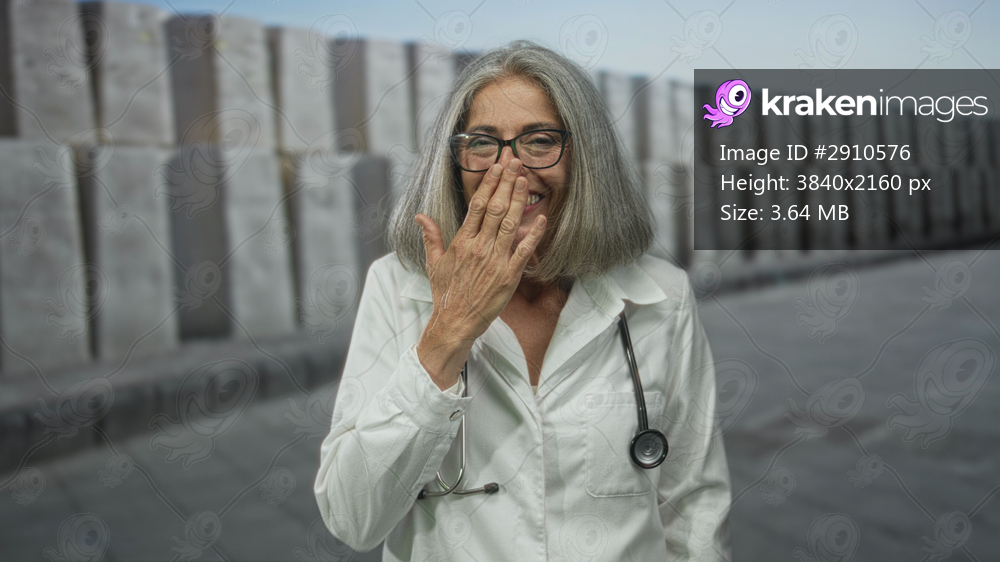 Woman doctor grey haired middle aged wearing stethoscope and glasses covers mouth with hand smiling on street; compassion joy.