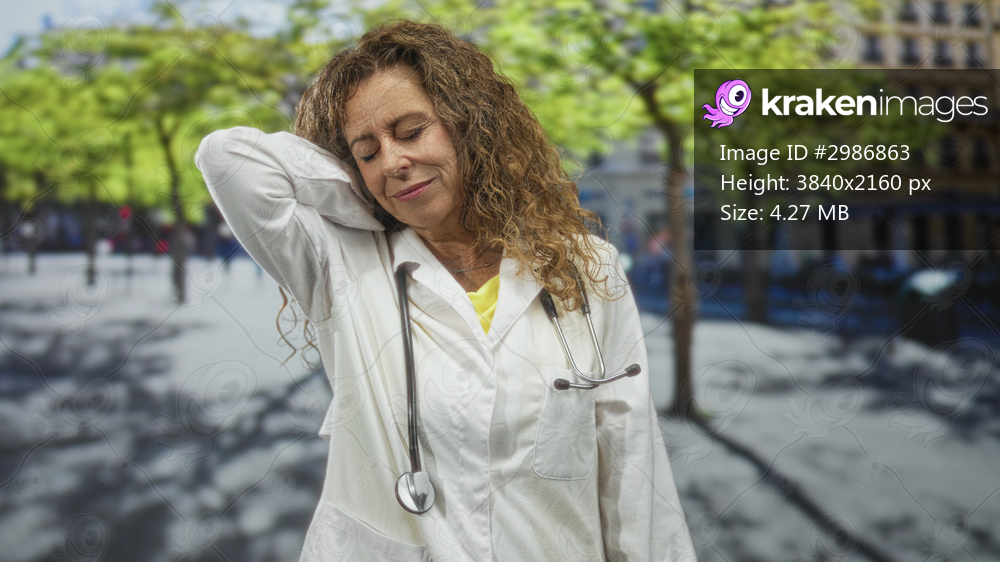 Woman doctor hand to neck, whitecoat with stethoscope in city street plaza, eyes closed in neck pain; fatigue.