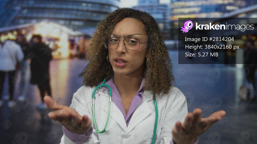 Woman doctor holding a stethoscope raises her hand with a questioning expression on a busy city street; uncertainty.