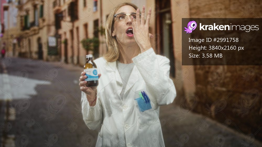 Woman doctor holding a syrup medicine bottle, hand raised on a street while smiling and mouth open; health relief trust.