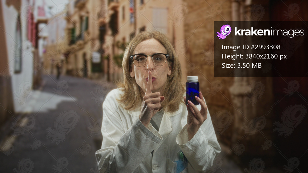 Woman doctor holding blue pill bottle, finger to lips for silence on a narrow street; secretive trust.