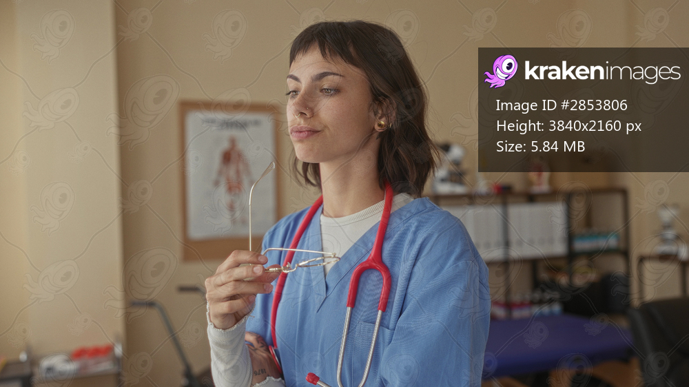 Woman doctor holding eyeglasses near chin and stethoscope in clinic with beige walls; reflection compassion.