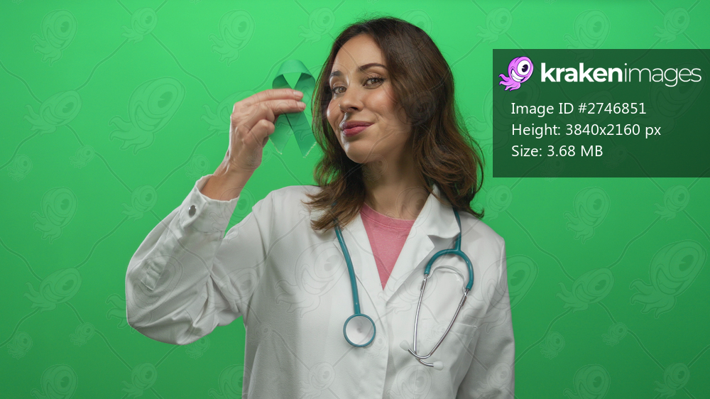 Woman doctor holding green ribbon with stethoscope against green isolated background, emphasizing healthcare awareness and support.