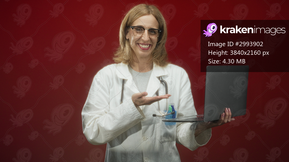 Woman doctor holding laptop and stethoscope, presenting with palm up hand gesture in studio against red backdrop while smiling and making eye contact; trust care confidence. - Kraken Images