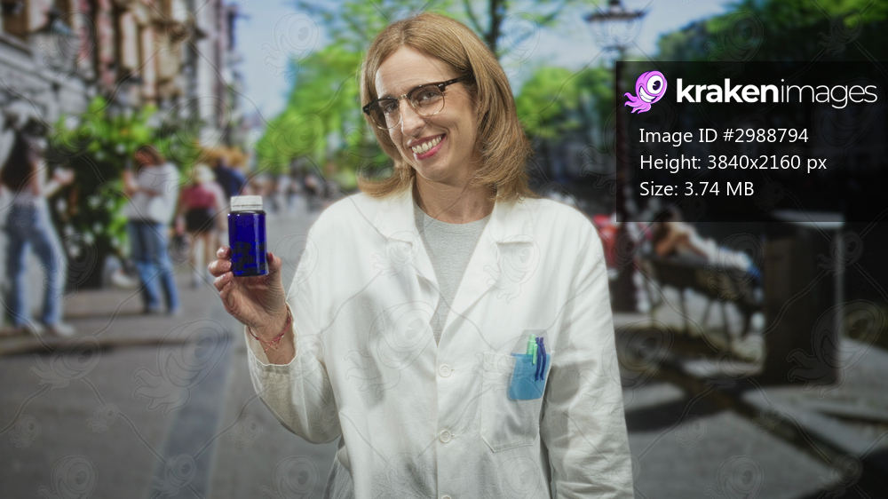 Woman doctor holding medicine bottle in hand on street, smiling and offering prescription; health reassurance.