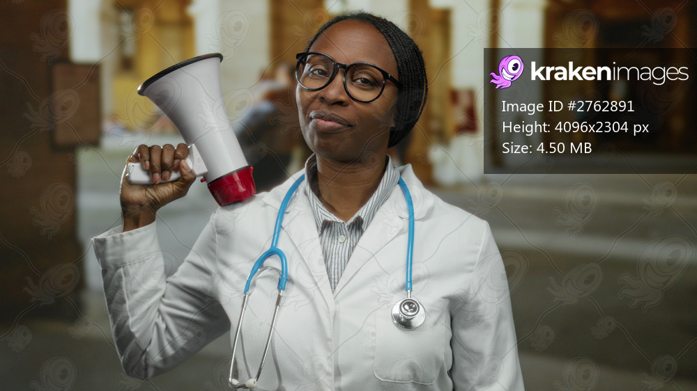 Woman doctor holding megaphone confidently in historic university setting with stethoscope.
