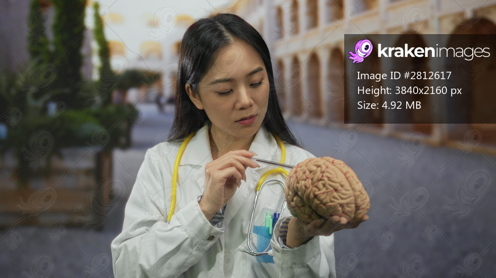 Woman doctor holding model brain with stethoscope outdoors in old town setting illustrating medical education concept vividly.