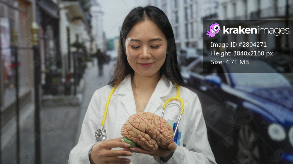Woman doctor holding and pointing at a brain model with a stethoscope on a vibrant urban street backdrop, showcasing medical professionalism outdoors.