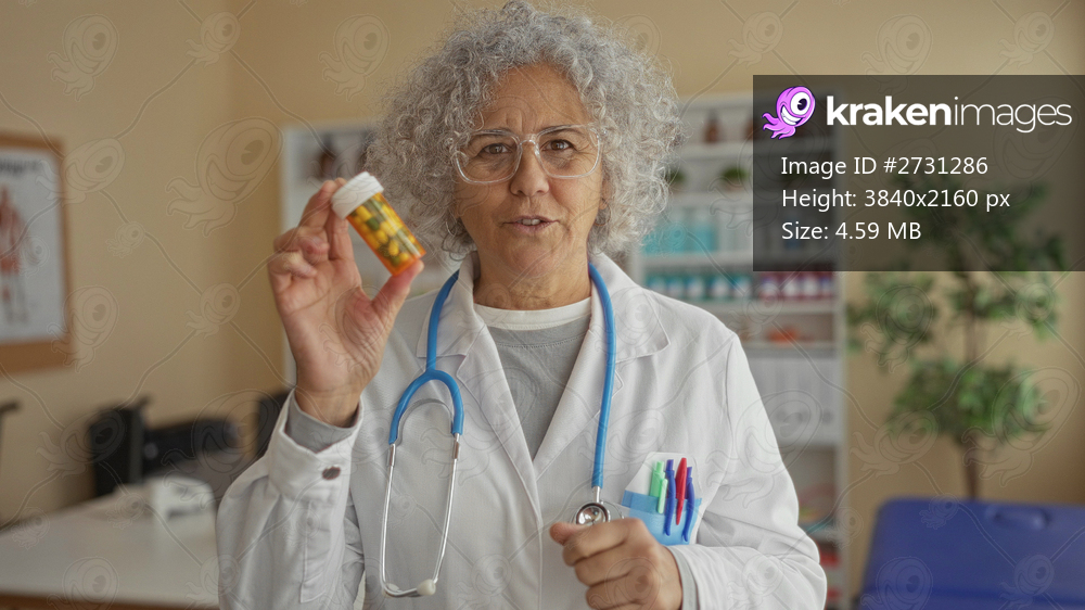 Woman doctor holding prescription pills in clinic room with stethoscope and grey hair showcasing medication in a professional workplace setting.