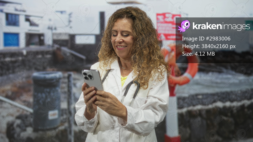 Woman doctor holding smartphone and lifting the phone to take a selfie at a harbor with a visible lifebuoy and stone dock; calm confidence.