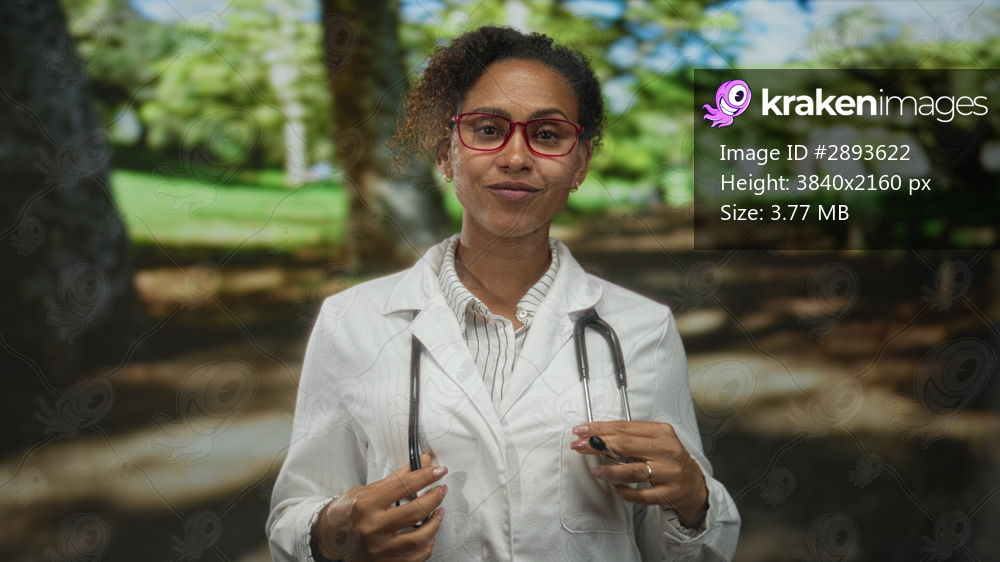 Woman doctor holding stethoscope and adjusting glasses on a shaded forest path with trees and dappled sunlight; confidence.