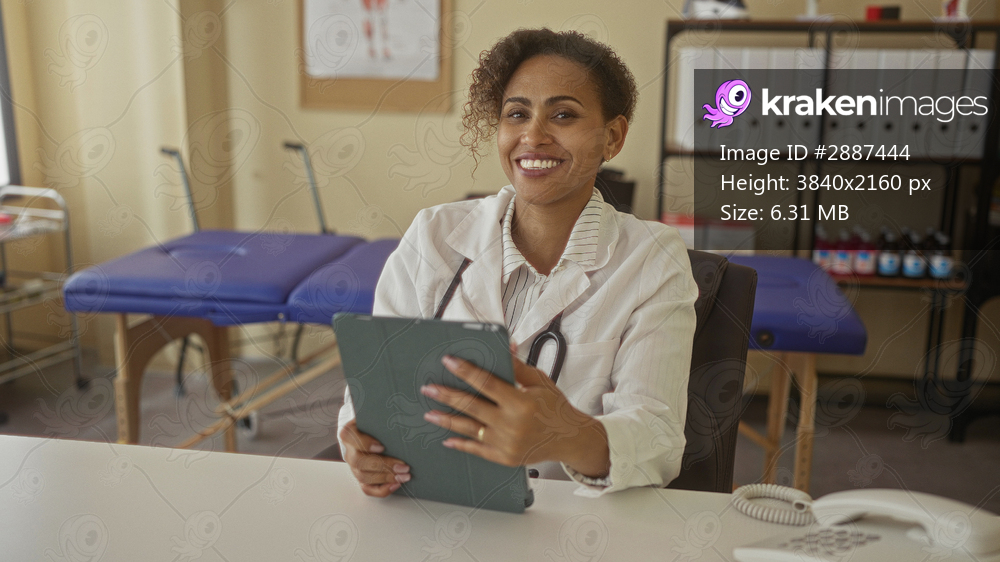 Woman doctor holding tablet with visible hands and stethoscope, reading patient notes at clinic desk; confidence care.