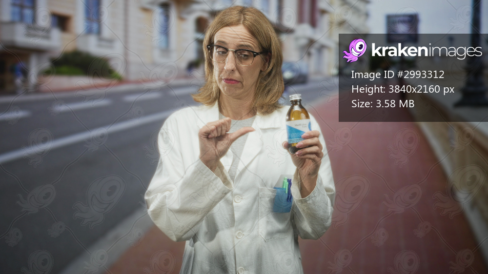 Woman doctor holds medicine bottle, thumb and forefinger pinching to show small dose on street; hesitation advice.